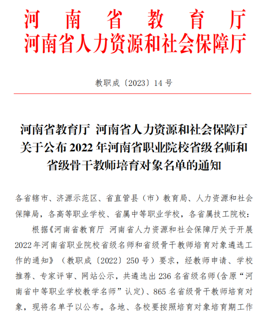 近日,河南省教育厅 河南省人力资源和社会保障厅下发了《关于公布2022年河南省职业院校省级名师和省级骨干教师培育对象名单的通知》(教职成[2023]14号),我院张晓丽等5位教师被遴选为省级名师培育对象,张江博等15位教师被遴选为省级骨干教师培育对象。... 阅读(1047)