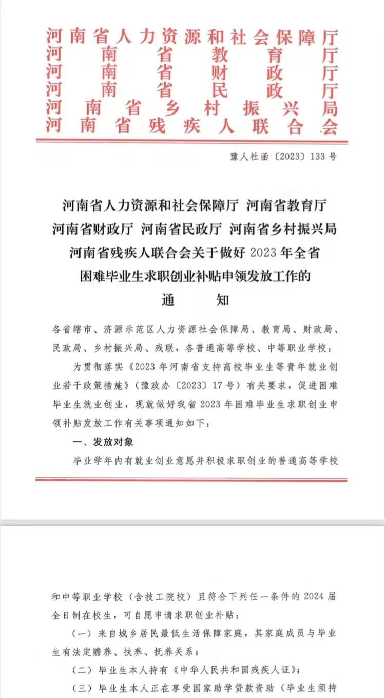 通知:根据河南省人力资源和社会保障厅、河南省教育厅、河南省财政厅、河南省民政厅、河南省乡村振兴局、河南省残疾人联合会等六部门联合印发的《关于做好2023年全省困难毕业生求职创业补贴申领发放工作的通知》(豫人社函〔2023〕133号)要求,现就做好我校2023年困难毕业生求职创业补贴申领发放工作有关事项通知如下:... 阅读(1001)
