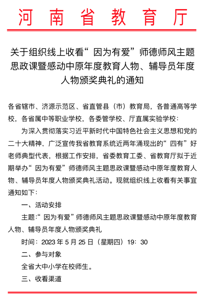 为深入贯彻落实党的二十大精神,广泛宣传河南省教育系统近两年涌现出的“四有”好老师典型代表,省委教育工委、省教育厅于5月25日晚19:30举办“因为有爱”师德师风主题思政课暨感动中原年度教育人物、辅导员年度人物颁奖典礼活动。漯河食品职业学院积极响应,认真落实,组织学校全体师生收看节目,一起见证榜样们的高光时刻。活动中,对...... 阅读(962)