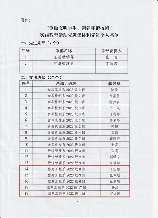 为了总结经验、表彰先进,推进工作,经过各班级评选系部审核推荐,学校研究审定,决定对信息工程系7个“文明班级”、10个“文明宿舍”、40个“文明学生”,予以表彰。李国柱老师在总结讲话中希望同学们以这次表彰会为契机,用自己的行动展现信息工程系的精神风貌,希望受到表彰的同学再接再厉,以更高的标准要求自己,发挥先锋模范作用,在信息工程系这个大家庭生活中留下成长的印记!