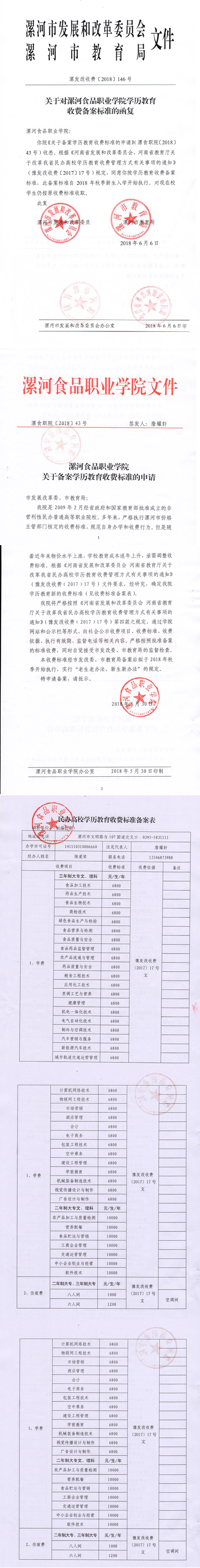 关于对漯河食品职业学院学历教育收费备案标准的函复