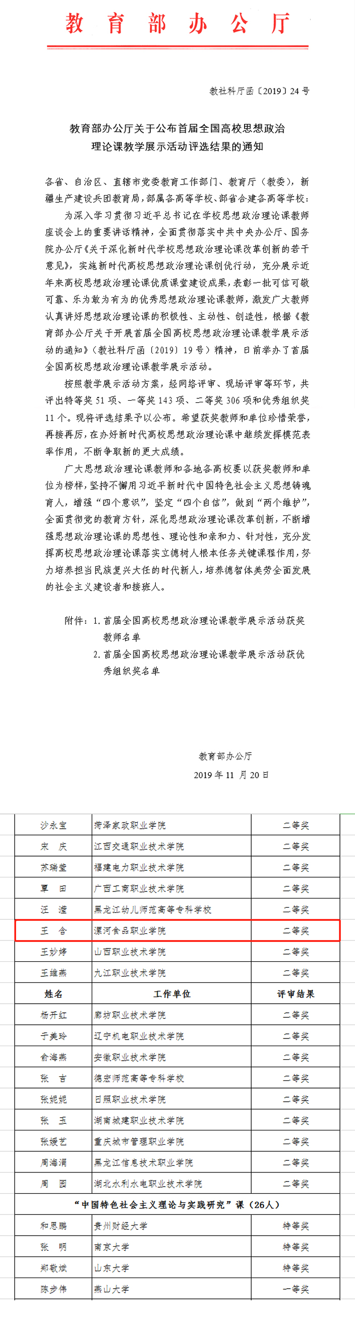 首届全国高校思想政治理论课教学展示活动在中国人民大学举行。此次思政课教学展示,分为本科“马克思主义基本原理概论”“毛泽东思想和中国特色社会主义理论体系概论”“中国近现代史纲要”“思想道德修养与法律基础”课,本专科“形势与政策”课,高职高专“毛泽东思想和中国特色社会主义理论体系概论”“思想道德修养与法律基础”课,研究生“中国特色社会主义理论与实践研究”“中国马克思主义与当代”课进行教学展示。此次教学展示活动是教育部深入学习贯彻习近平总书记在学校思想政治理论课教师座谈会上的重要讲话精神,落实中共中央办公厅、国务院办公厅《关于深化新时代学校思想政治理论课改革创新的若干意见》,实施“新时代高校思想政治理论课创优行动”的重要工作之一,是近年来第一次由教育部官方主办的教学展示活动。该教学展示活动经网络评审、现场评审等环节,我院思政课教师王含作为河南省高职高专“思想道德修养与法律基础”课展示代表之一,一路过关斩将,最终喜获二等奖。