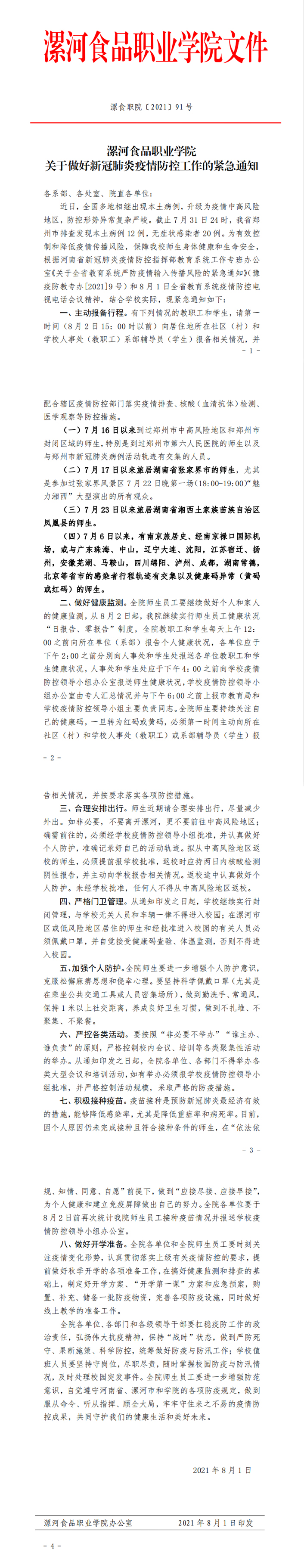 漯河食品职业学院 关于做好新冠肺炎疫情防控工作的紧急通知