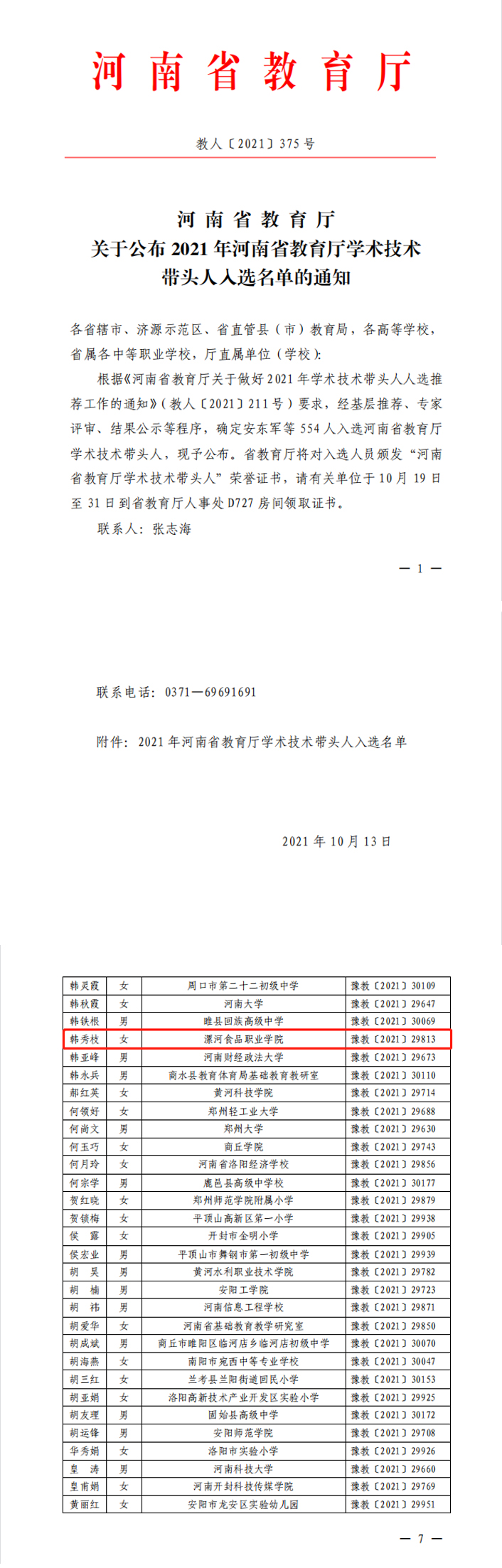 韩秀枝入选河南省教育厅科学技术带头人名单