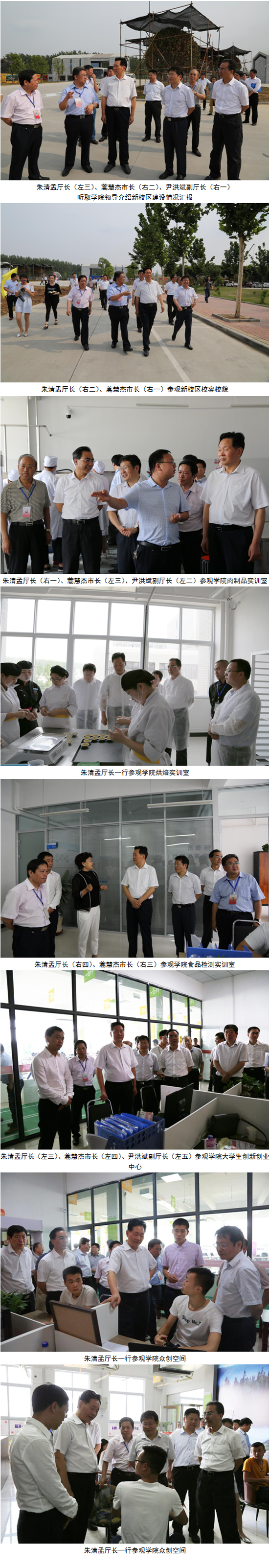 调研中,朱厅长首先听取了董事长詹耀轩就我院新校区规划建设情况的汇报,然后深入我院实验实训室,对学院的功能饮料、高低温肉制品实训室、大匠烘焙实训室、中标检测实训室等进行了详细了解,同时饶有兴致的品尝了烘焙学院制作的糕点。朱厅长参观后,就我院产学结合,校企合作给予了充分肯定。在沙澧众创空间,朱厅长一行就我院大学生就业创业等情况进行了详细的了解。了解到在校大学生自主创办的一家网店通过学校的支持营业额大幅增加,朱厅长对此给予了赞许。