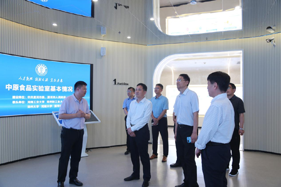 在中原食品实验室,漯河食品职业学院副院长、中原食品实验室副主任陈树兴和学院科技处处长崔胜文分别向曹忠义一行介绍了中原食品实验室立足“人才高地、创新之源、食品未来”功能定位和“面向国际、立足全国、服务河南”的战略定位,着力打造“实验室+研究生院+孵化器+中试基地+产业基金+产业园区”的全链条科研转化体系的独特办学优势。曹忠义对中原食品实验室汇聚院士、长江、杰青等国家级人才,攻破具有重大应用前景的新技术,成为具有国际影响力的高层次人才培养基地这一发展目标给予高度评价。