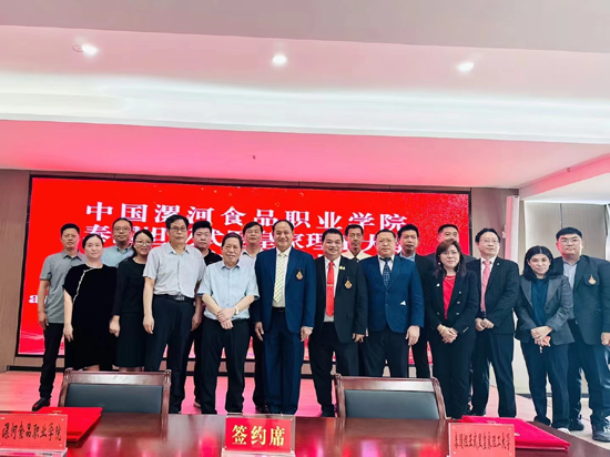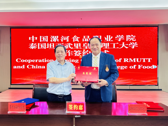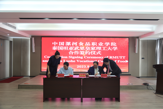 在合作协议签署环节,漯河食品职业学院党委副书记、创办人詹跃勇,董事长助理、国际教育学院院长詹清华;泰国坦亚武里皇家理工大学校长颂迈,科学与技术学院院长尼帕特·琼萨瓦特共同签署了合作协议。