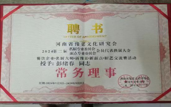 2024年9月3日,我院教师彭绪春受邀参加河南省豫菜文化研究会名厨专业委员会面点专业委员会举办的第二届会员代表换届大会及新豫菜新面点传统小吃餐饮企业名厨大师交流赛活动,并获聘河南省豫菜文化研究会名厨委员会常务理事。本次活动在郑州青龙山庄隆重举行。