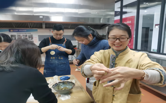 营养烹饪系全体教师齐聚实训室,各自发挥专长,忙得不亦乐乎,有的擀皮、有的包饺子,一边交流分享着包饺子技能,一边聊着自己在家中包饺子时发生的趣事,气氛和谐、笑语不断,到处洋溢着“家”的温馨。不一会儿,托盘里就摆满了一个个白胖胖的饺子。